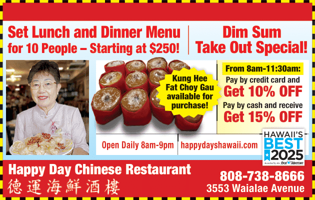Hawaii is a culturally diverse state, offering flavors from every corner of the world. When you’re in the mood for Chinese cuisine, Happy Day is the perfect place to satisfy your cravings. Using fresh, local ingredients, we serve authentic dishes and all your favorites. From fried rice to dim sum, we proudly offer the best food in the greater Honolulu area and are always here to satisfy your hunger.